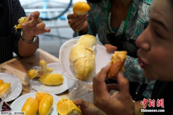 展銷部分邀請(qǐng)了來(lái)自泰國(guó)50個(gè)府的農(nóng)民銷售榴蓮、芒果、紅毛丹等熱帶水果和榴蓮比薩等制品。