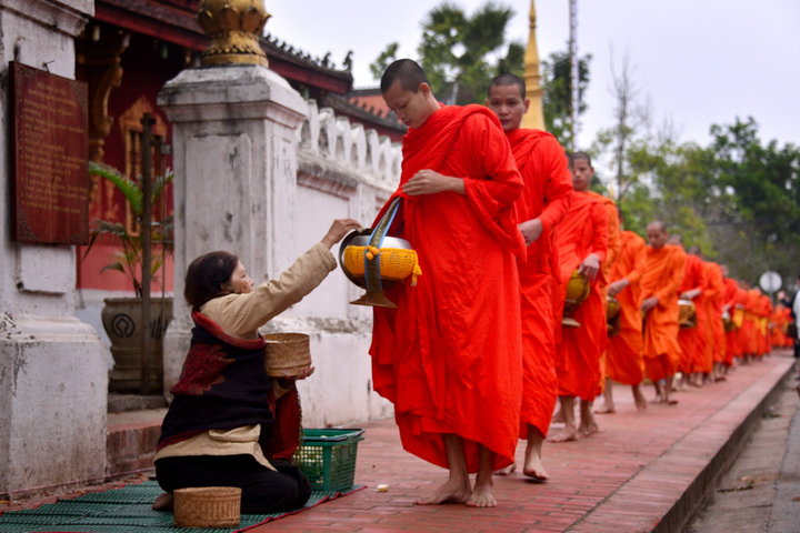 在老撾的許多地方,布施是一道獨(dú)特的風(fēng)景。每天拂曉,僧人們會(huì)離開(kāi)寺院,身披橙色袈裟,結(jié)隊(duì)到街道上或村莊里化齋。虔誠(chéng)的佛教徒跪在道路的一邊,雙掌合十,接受僧侶誦經(jīng)祝福。誦經(jīng)完畢,僧侶們排著隊(duì)伍依次從人們的面前赤腳行過(guò),人們把米飯、餅干、水果、雞肉等食物放進(jìn)僧人們的竹編小籃中。這些食品,就是僧人們一天的口糧。