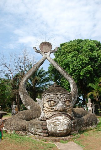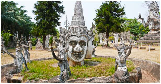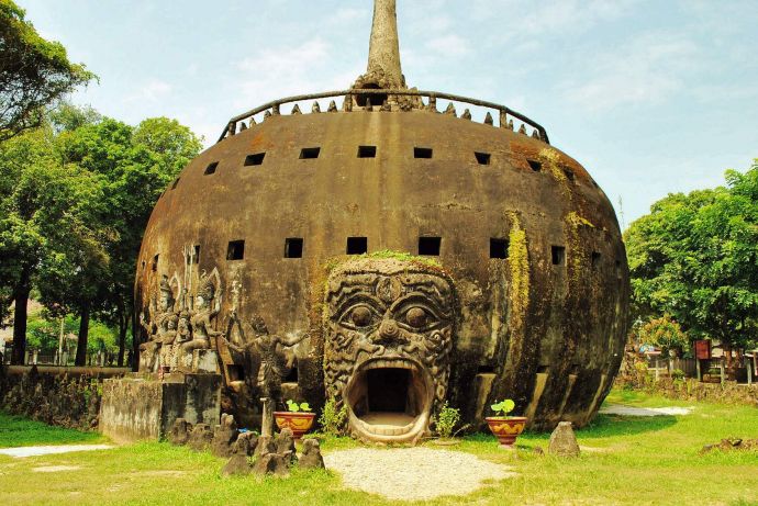 坐落在首都萬(wàn)象東南部湄公河畔上的香昆寺(又叫佛像公園),寺如其名,公園里到處都是千姿百態(tài)的佛像和雕塑,這是一個(gè)怪人荒誕野心的紀(jì)念物。它的創(chuàng)建者創(chuàng)建者班勒威·蘇里拉是一名泰國(guó)僧侶,他將印度教和佛教的哲學(xué)思想、傳說(shuō)和肖像學(xué)融會(huì)貫通,組合成一個(gè)神秘的整體。
