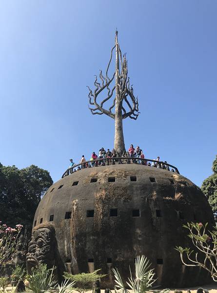 香昆寺里有一座球形的塔,與河對(duì)岸廊開(泰國(guó))的萬(wàn)橋公園遙相呼應(yīng),這便是著名的“天堂地獄塔”。每個(gè)來(lái)這里的人都要進(jìn)去走一走,體驗(yàn)從“從地獄到天堂”的過(guò)程。