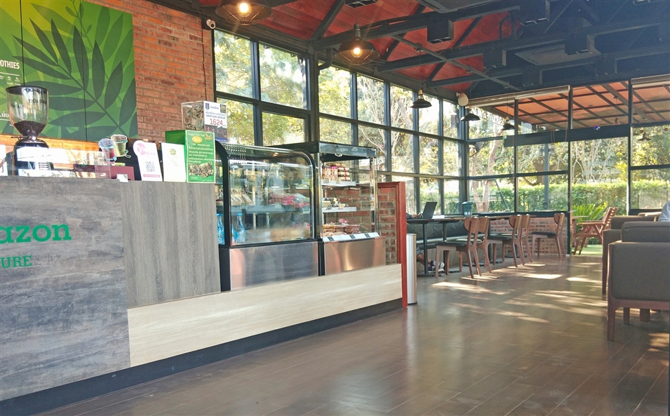 亞馬遜咖啡館的紅磚外墻與干凈明亮的落地窗相映,充滿休閑氣息。室內(nèi)寬敞整潔,歸本主義的原木桌椅,適合打發(fā)午后的閑暇時(shí)光。
