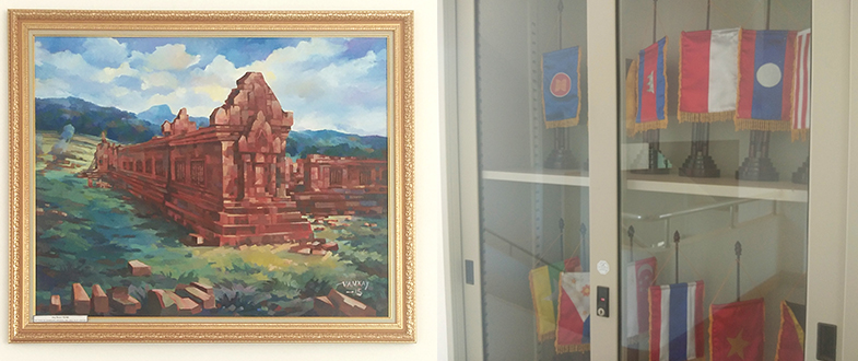二樓樓梯拐角處掛著老撾古老寺廟油畫(huà),旁邊的柜子里整齊擺放著幾排各國(guó)國(guó)旗;三樓樓梯拐角處掛的則是川壙省石缸平原油畫(huà),充滿了藝術(shù)氛圍。