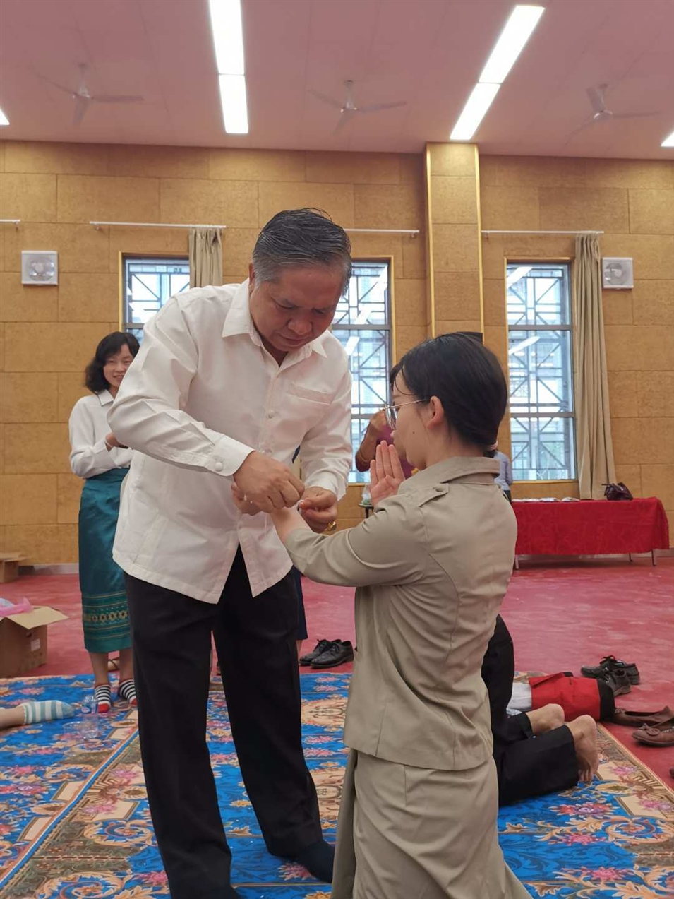 (老撾國(guó)立大學(xué)校長(zhǎng)宋西.諾潘塞在給老師栓線(xiàn)祝福)