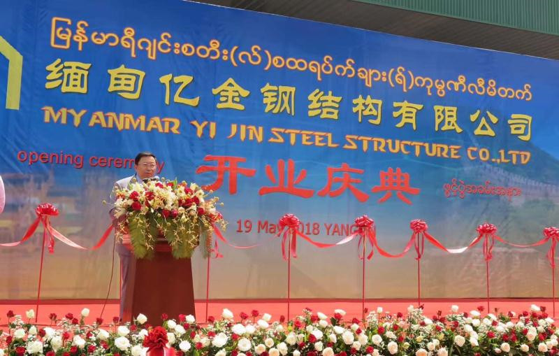 2018年仰光市,中國—東盟商務(wù)理事會執(zhí)行理事長許寧寧應(yīng)邀在緬甸億金鋼結(jié)構(gòu)公司開業(yè)盛典上致辭:中緬企業(yè)增進合作、共同發(fā)展。該公司是中緬合資,是緬甸最大的鋼結(jié)構(gòu)加工和安裝企業(yè),承建了包括緬甸國家體育館、曼德勒商務(wù)與會議中心等多個標(biāo)志性建筑。
