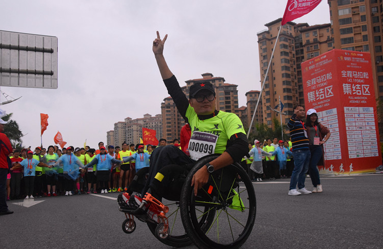 在眾多的選手中,坐在輪椅上的張先生顯得尤為搶眼。張先生來自廣州,他告訴記者,這是他參加的第54場馬拉松比賽,也是第一次參加全海景跑道的馬拉松, “我參加比賽不是為了出成績或出風頭,而是重在參與,是想體現(xiàn)一種精神?!睆埾壬f,他不一定能全部“跑”完全程,但他一定會堅持到最后。